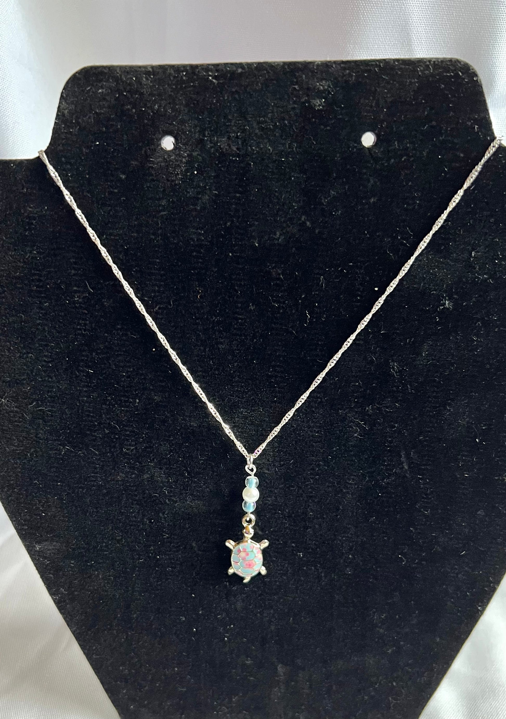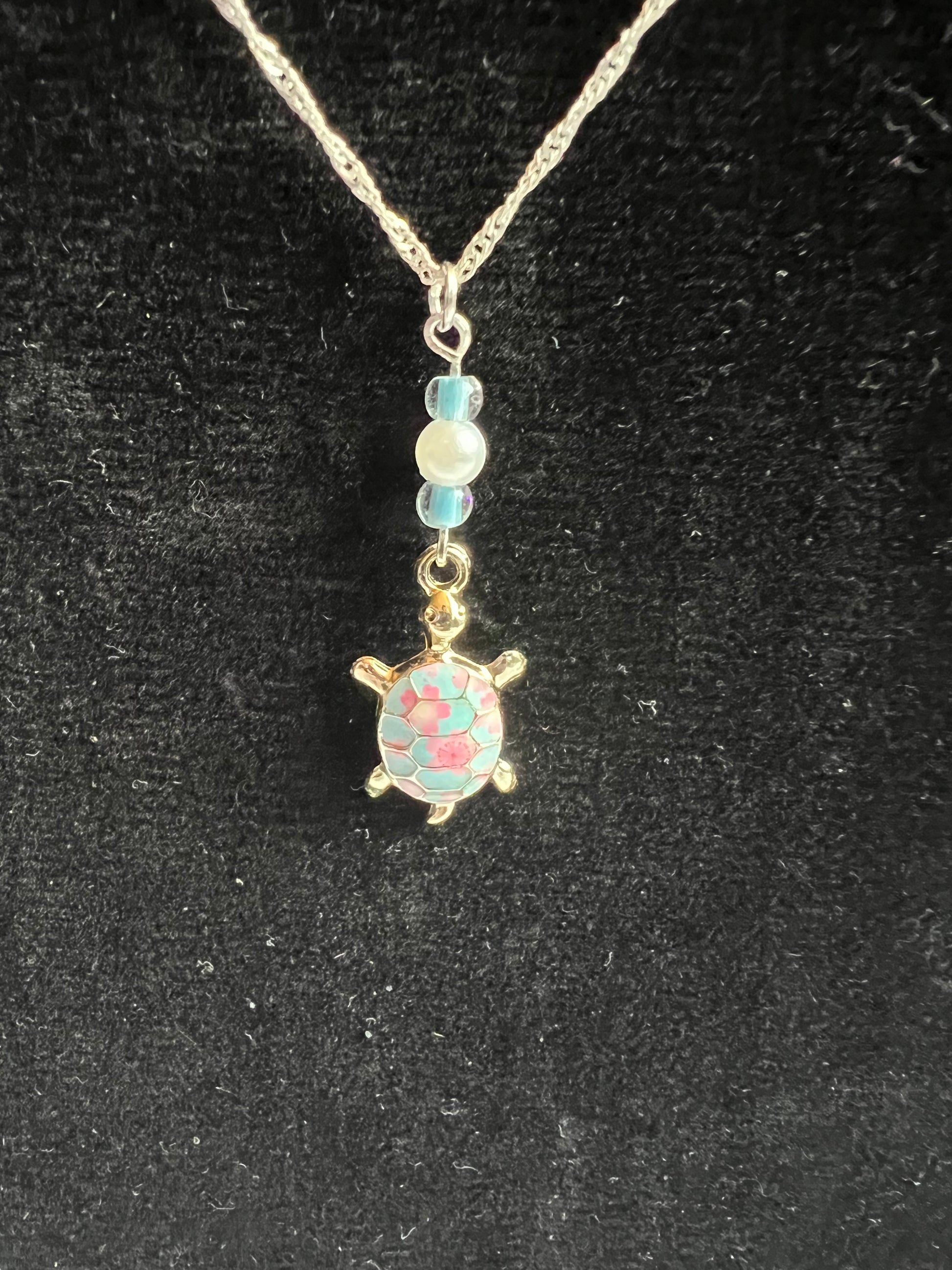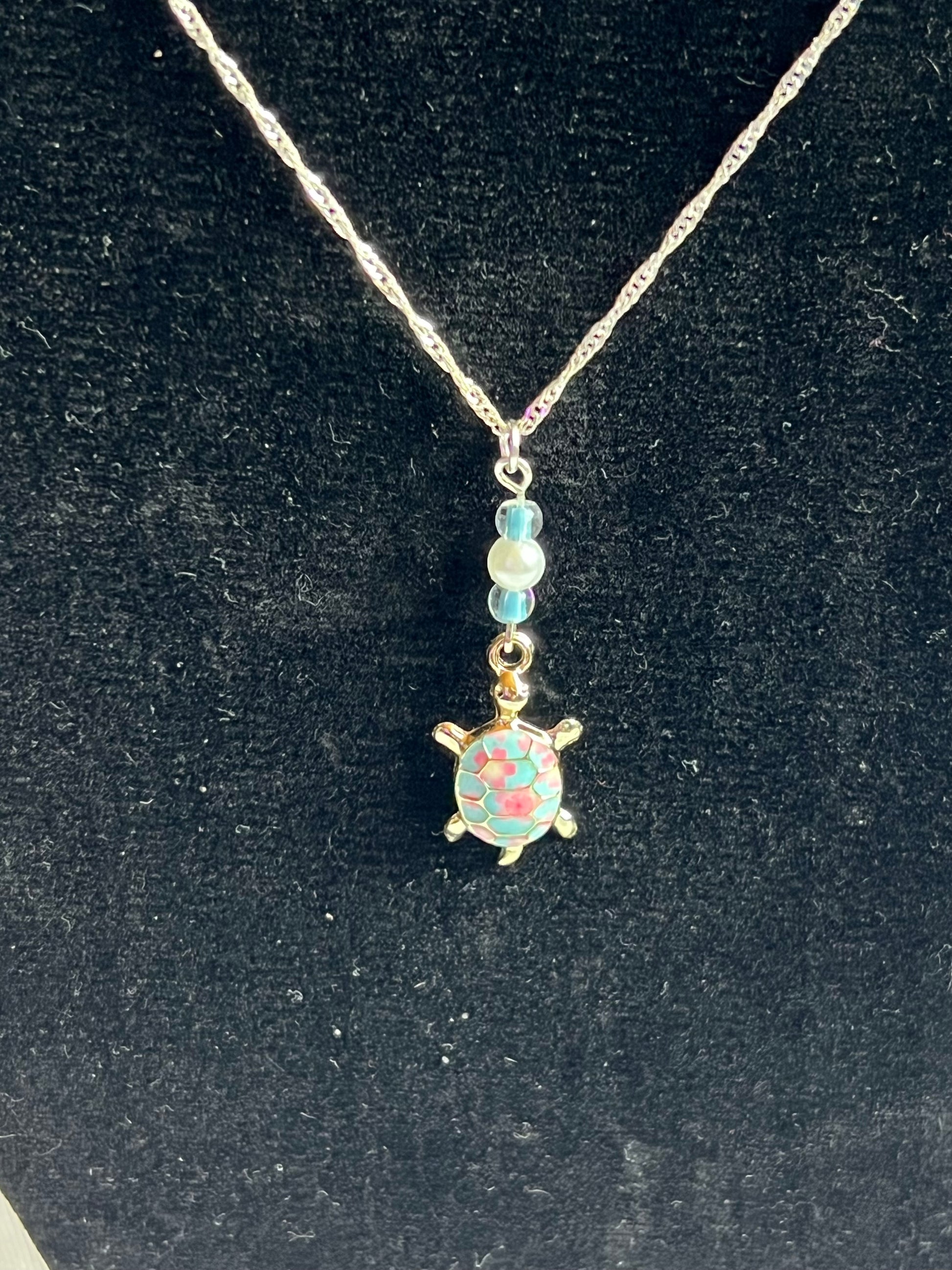 Diese Wundervolle Kette mit einer kleinen Schildkröte bringt sommerliches Feeling. Abgerundet wird das ganze mit wundervollen Perlen die etwas magisches an sich haben, denn die blauen Perlen verwandeln sich in lila Perlen in den warmen Sonnen strahlen.