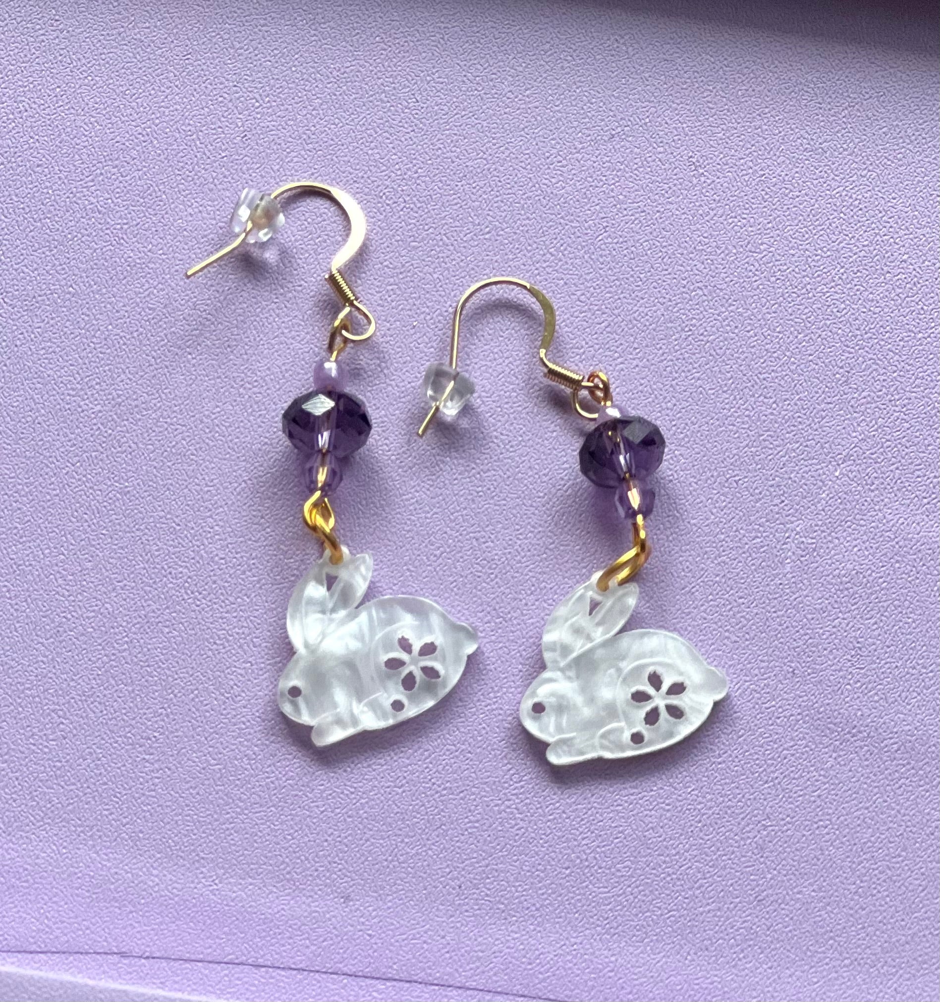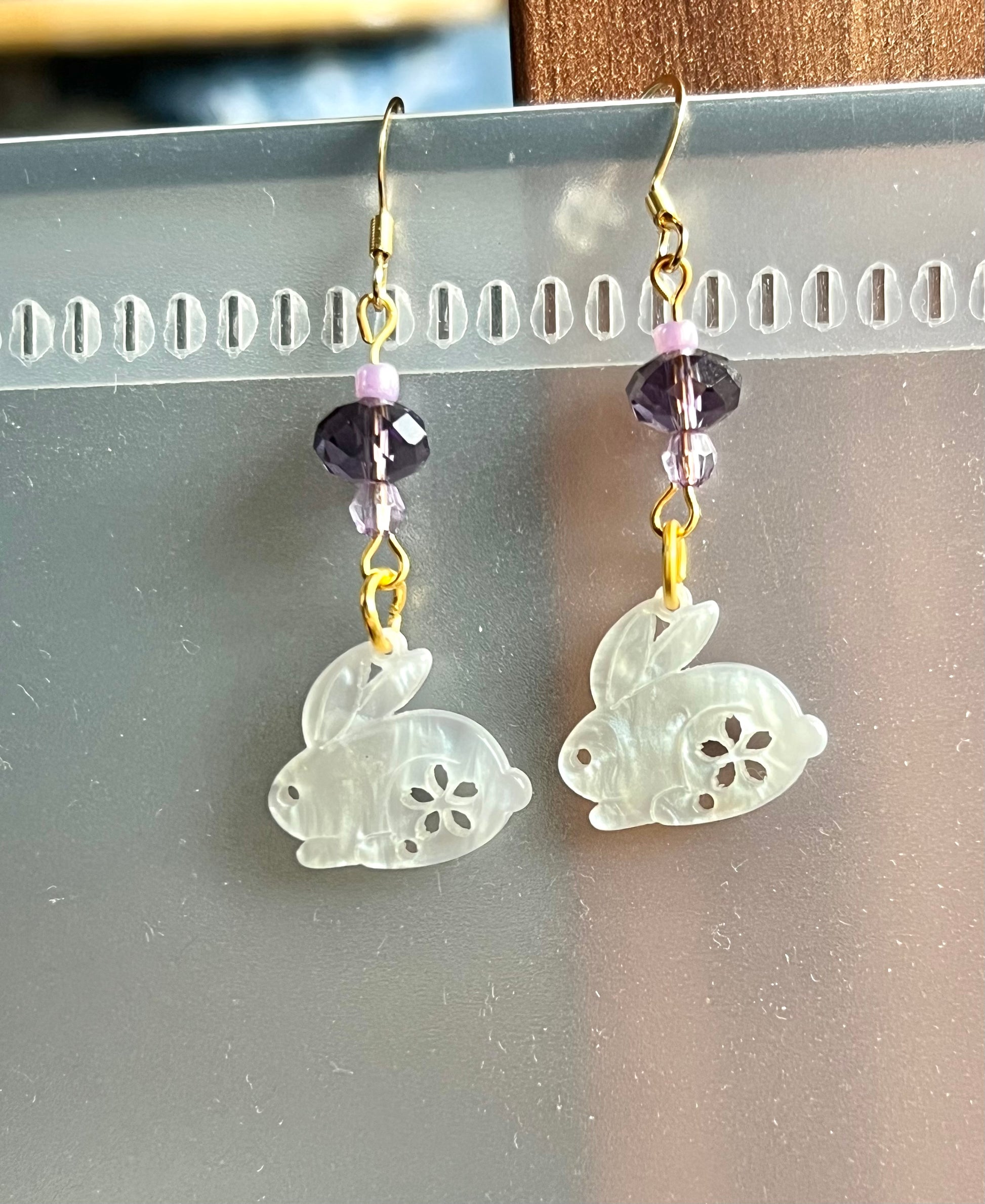 Edelstahl Ohrringe Usagi Shinju Weißer Hase Lila Perle