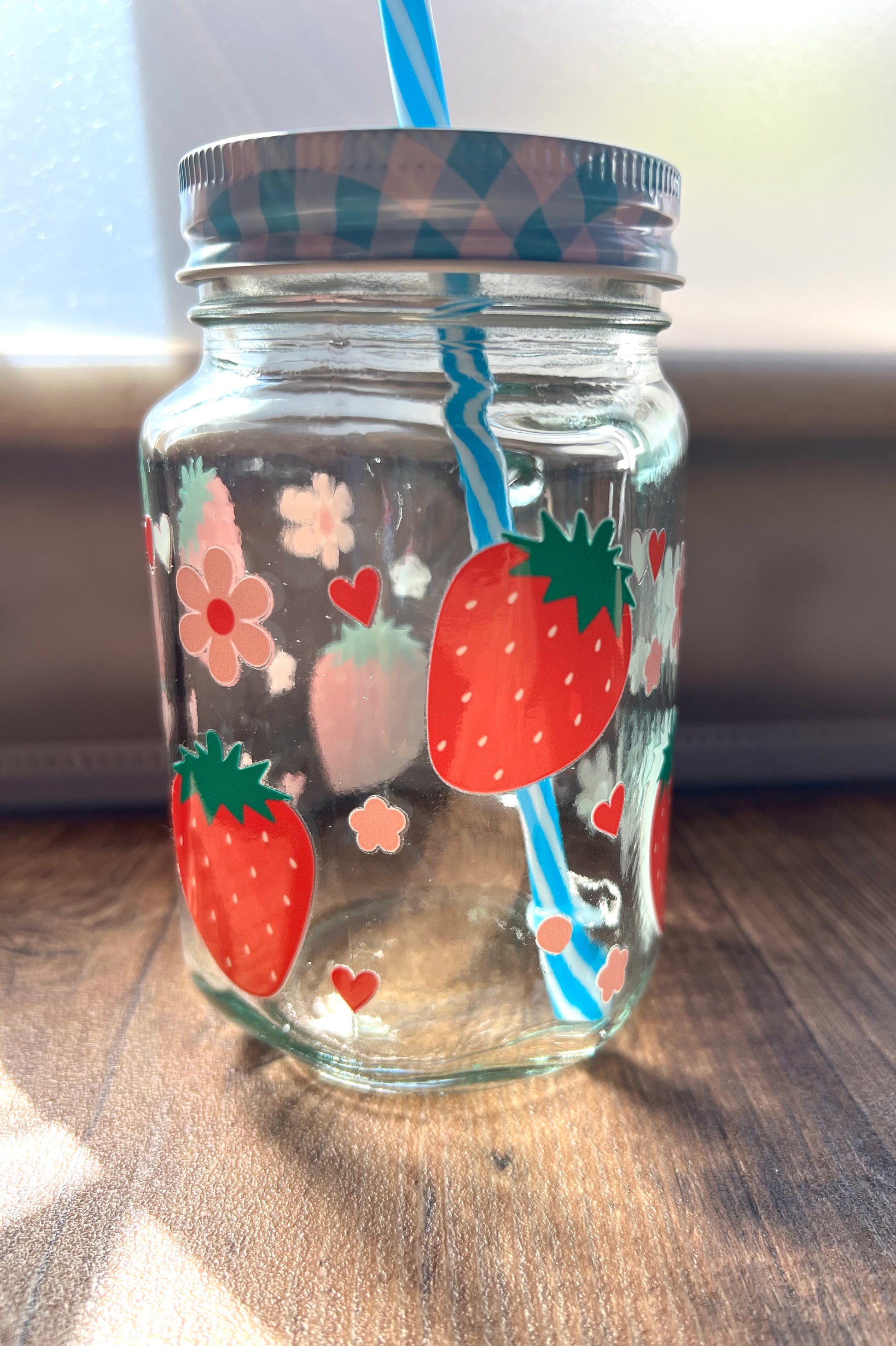 Nachhaltiges Trinkglas 450ml mit Mehrweg-Strohhalm & Erdbeersticker