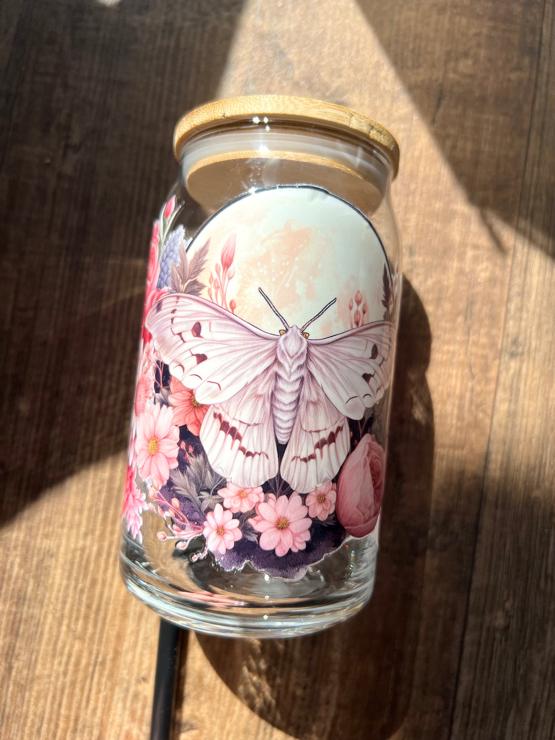 B Ware Nachhaltiges Trinkglas 500ml mit Strohhalm & Motten Motiv