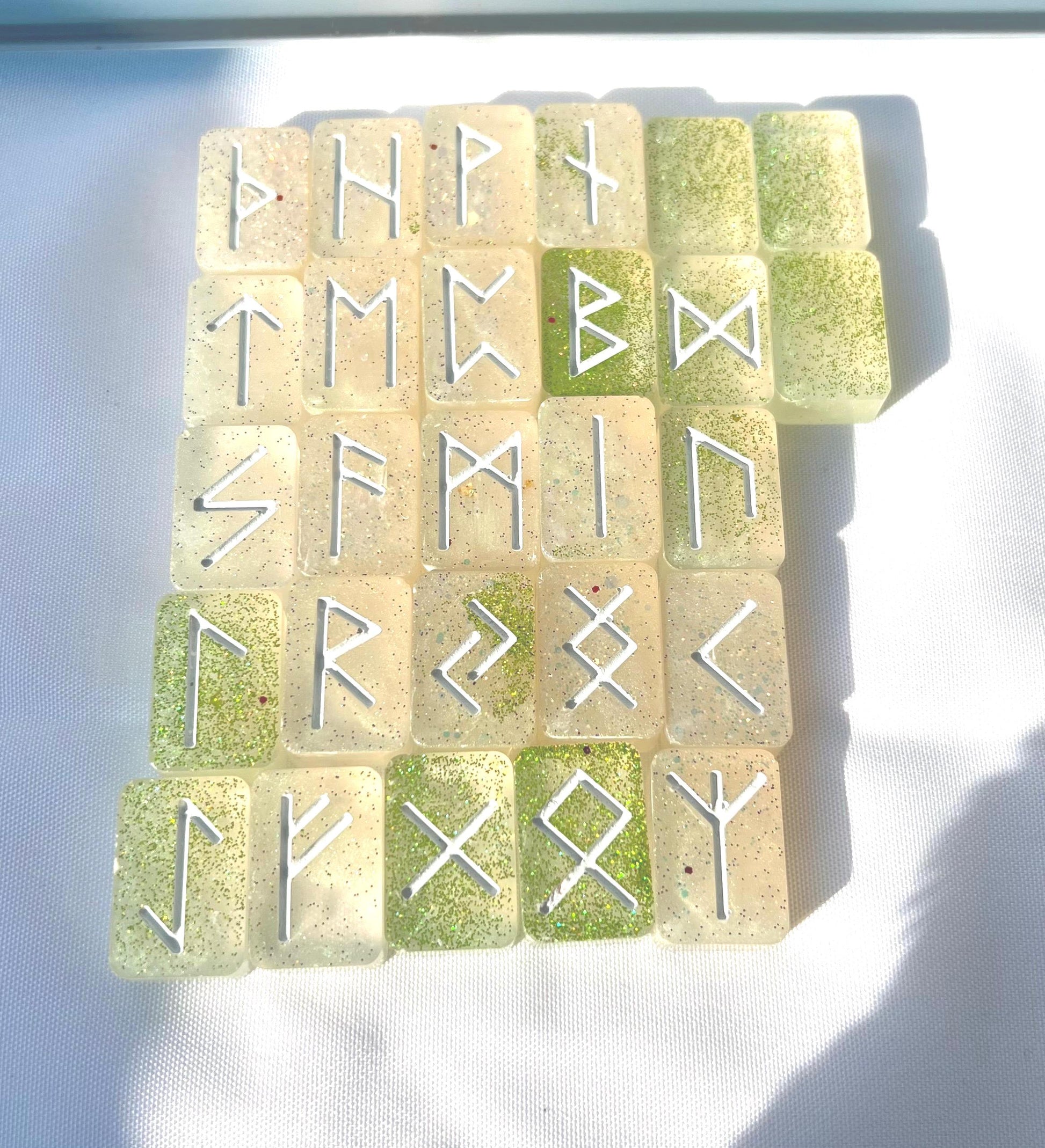 Dieses Set handgefertigten Runensteinen besteht aus Epoxidharz. Die Steine sind leicht durchsichtig mit cremefarbenem Glitzer und grünem Glitzer.